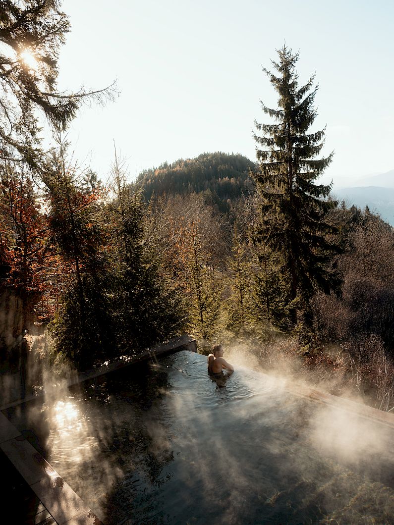 Wald. Wärme. Ruhe - und Entspannung, wie sie in der japanischen Heilkunst seit Jahrhunderten zelebriert wird. Der ONSEN POOL im Boutique Hotel MIRAMONTI hoch über Meran ist ein Ensemble aus Natur, Stille und Klarheit.
