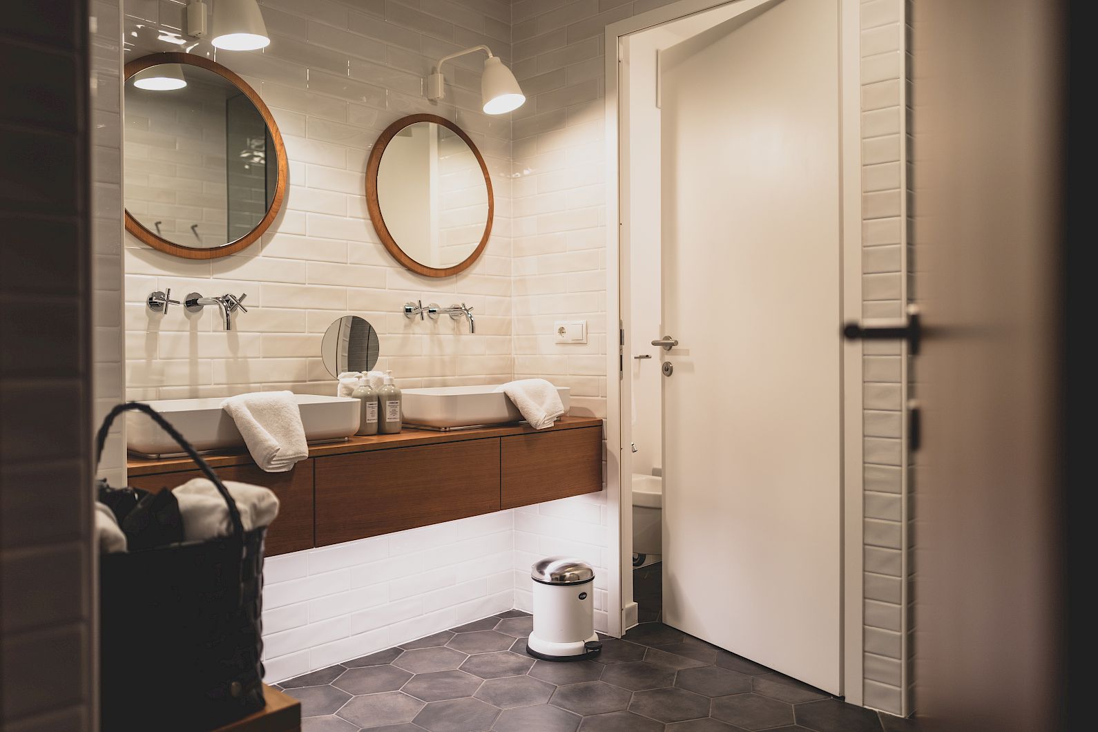 Cherry wood meets elegant midnight blue, the bed opposite the floor-to-ceiling glass front, south-facing balcony in glass, desk, original Fritz Hansen furniture, the roof garden with cherry wood and skylight.